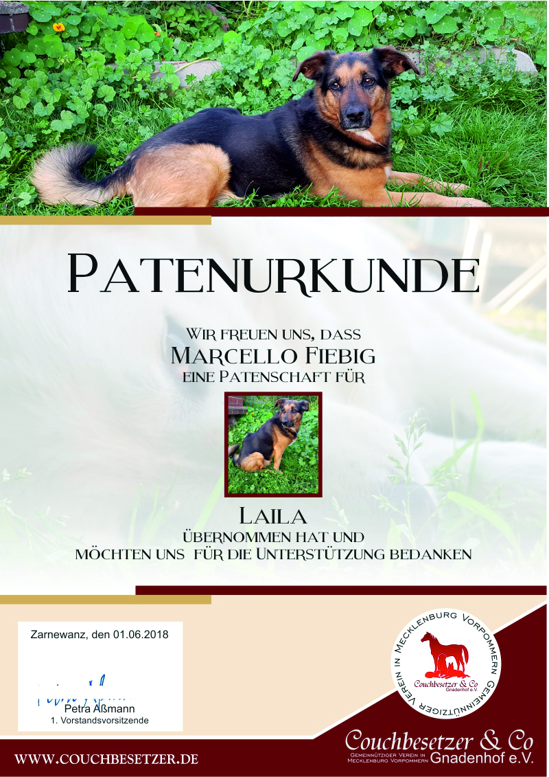 Wir möchten uns an dieser Stelle bei Marcello und Yvonne Fiebig , für Laila´s Patenschaft Bedanken. Wir freuten uns auch sehr, das beide ihr Patentier regelmäßig besuchten.